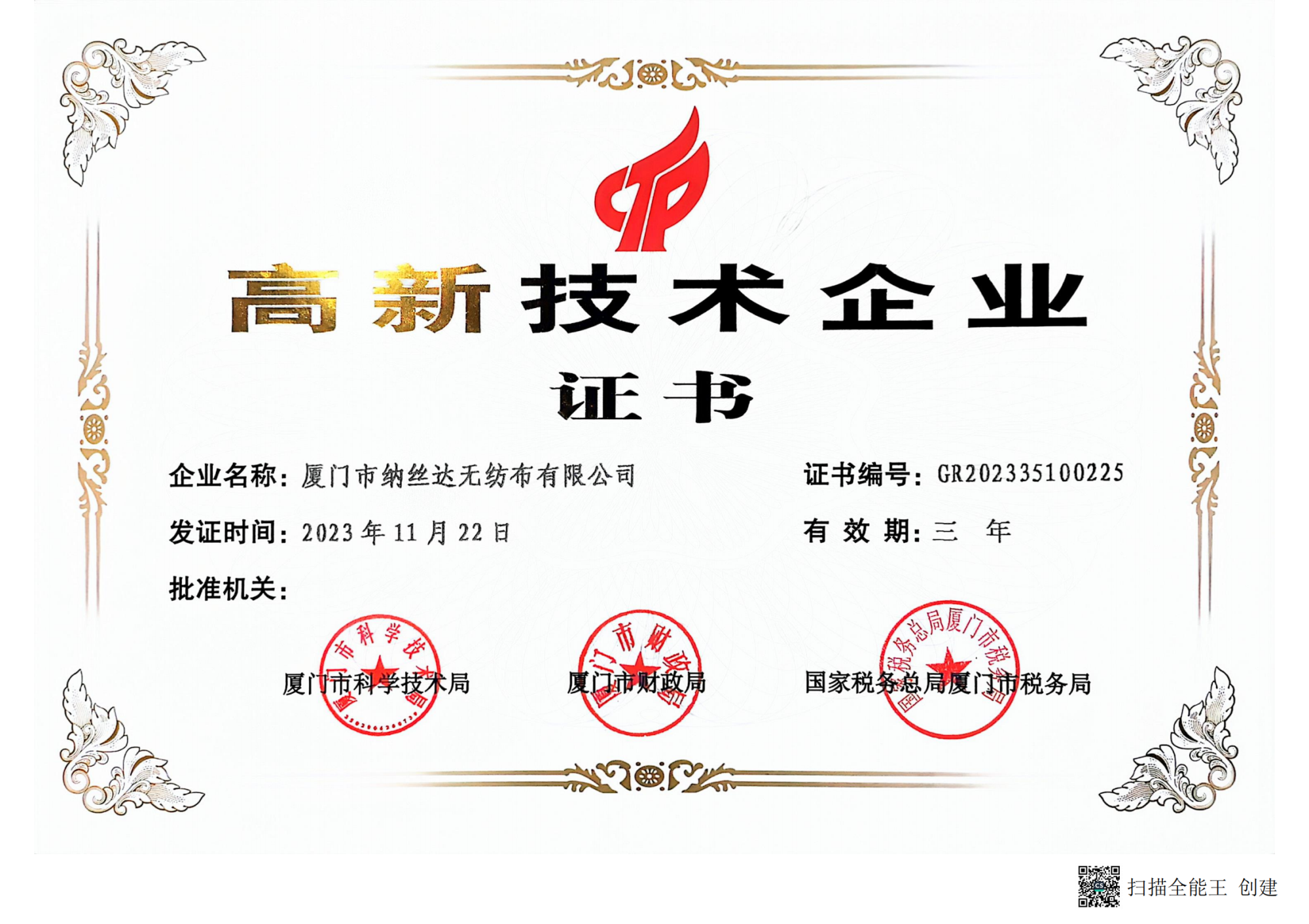 國家高新技術(shù)證書