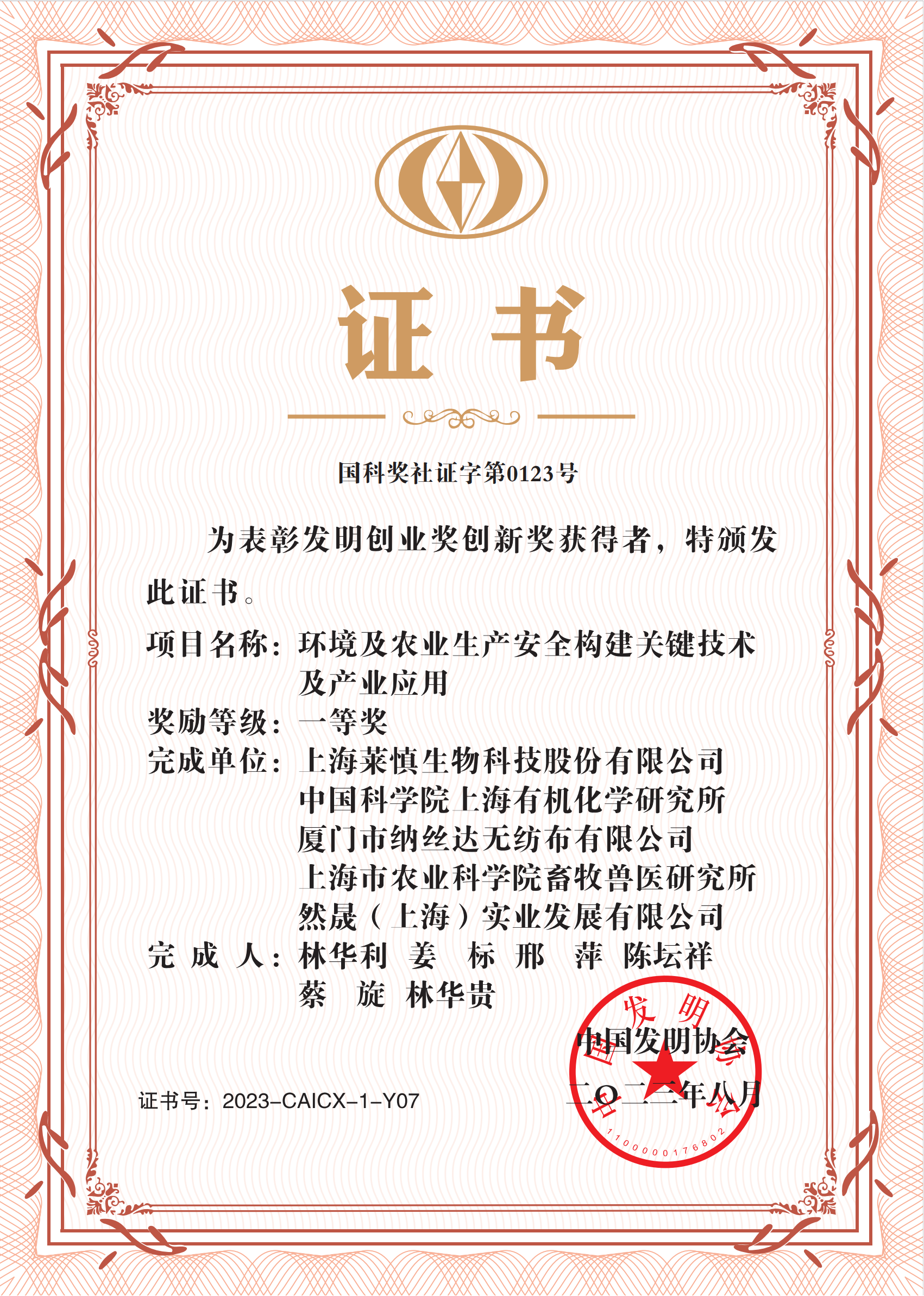 發(fā)明者協(xié)會一等獎證書